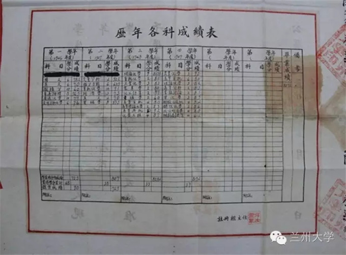 国立兰州大学时期毕业证书背面(背面为该生历年各科成绩表)